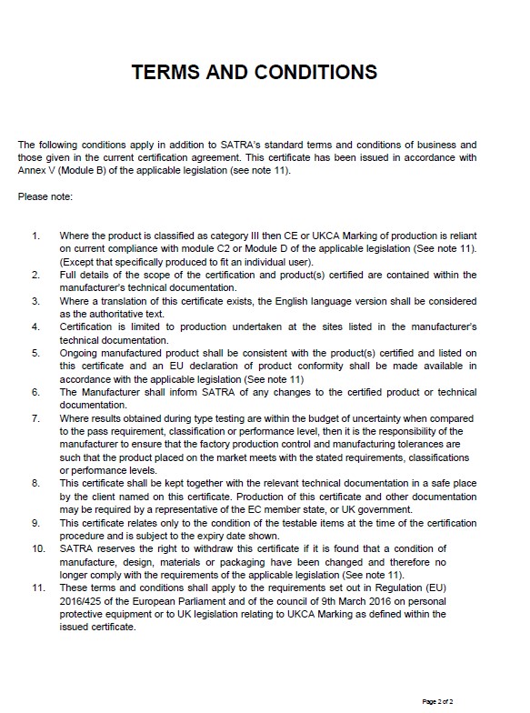 Zgoraj navedeni izdelki izpolnjujejo bistvene varnostne in zdravstvene zahteve iz Priloge II Uredbe EU 2016/425 in so razvrščeni kot osebna zaščitna oprema kategorije III (Priloga 1 Evropske uredbe 2016/425).