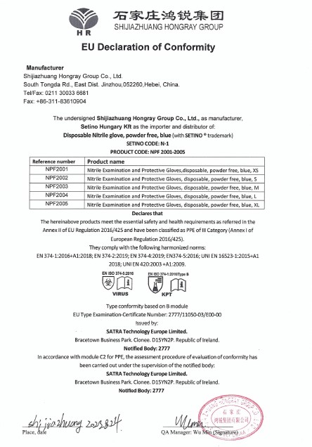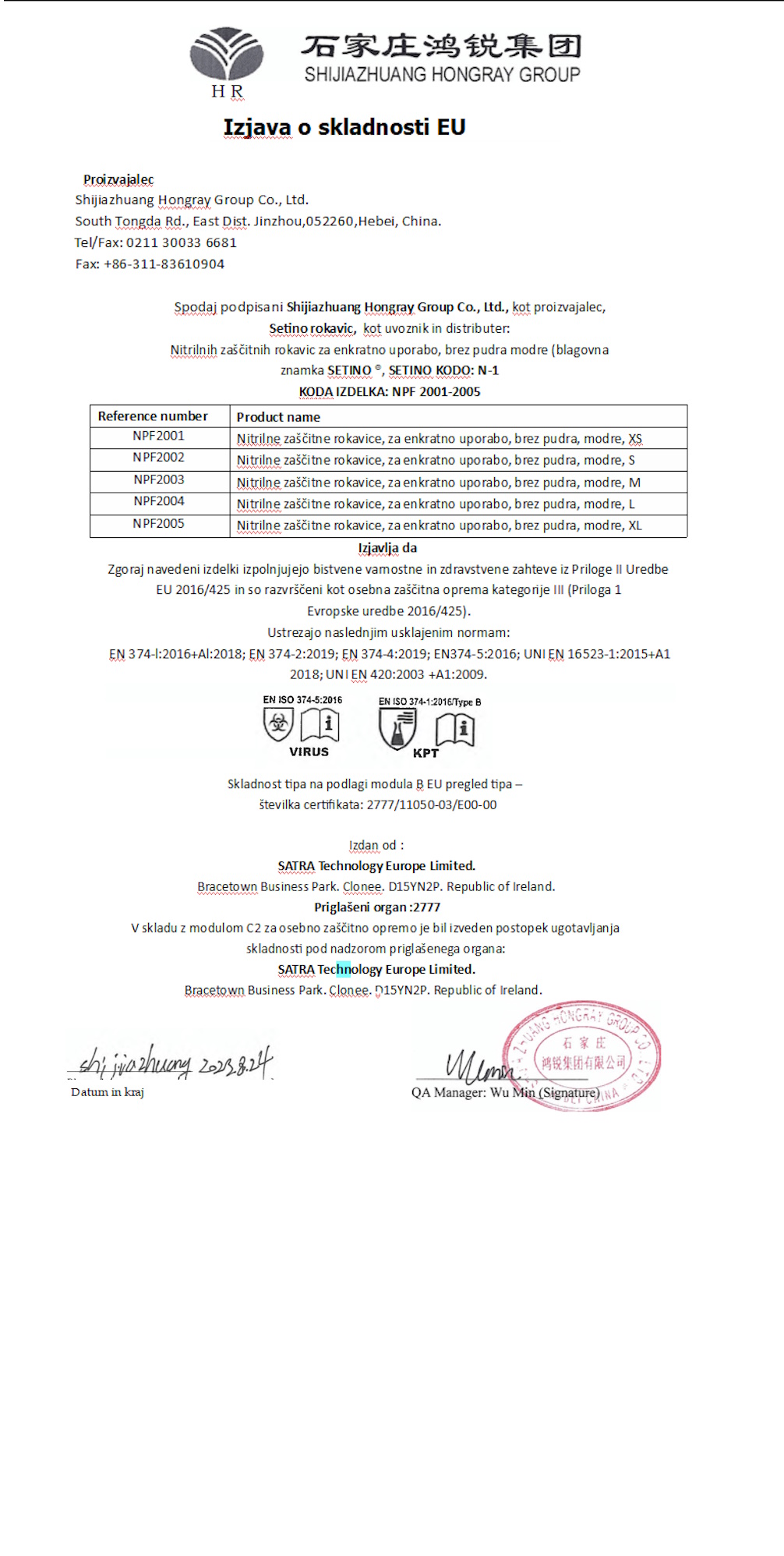 Spodaj podpisani Shijiazhuang Hongray Group Co., Ltd., kot proizvajalec, Setino rokavic, kot uvoznik in distributer: